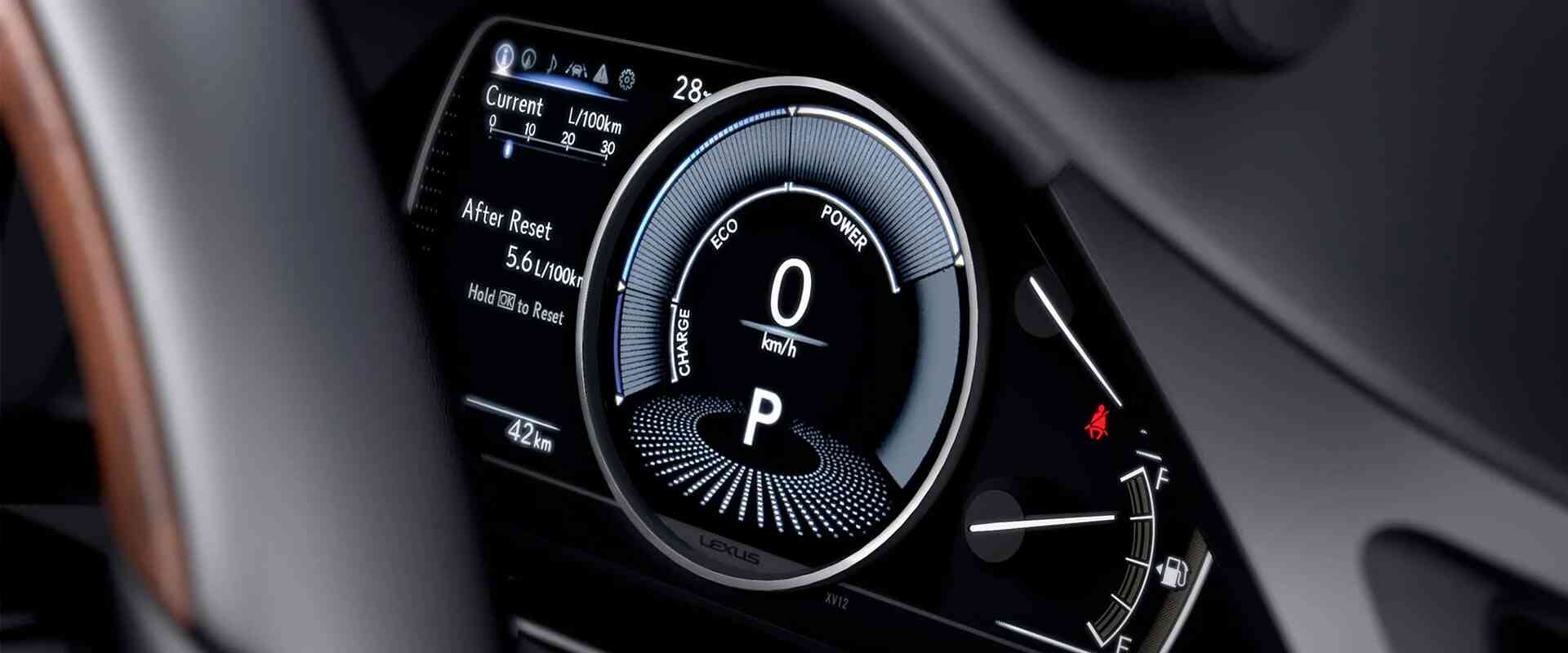 Cụm đồng hồ kỹ thuật số TFT LCD 12.3 inch của Lexus ES300h hiển thị đầy đủ thông tin vận hành với độ phân giải cao. Giao diện có thể tùy chỉnh theo sở thích, bao gồm chế độ Normal, Sport, Eco và Custom. Đặc biệt, màn hình hiển thị rõ ràng trạng thái hoạt động của hệ thống hybrid, giúp người lái tối ưu hóa hiệu suất tiết kiệm nhiên liệu.