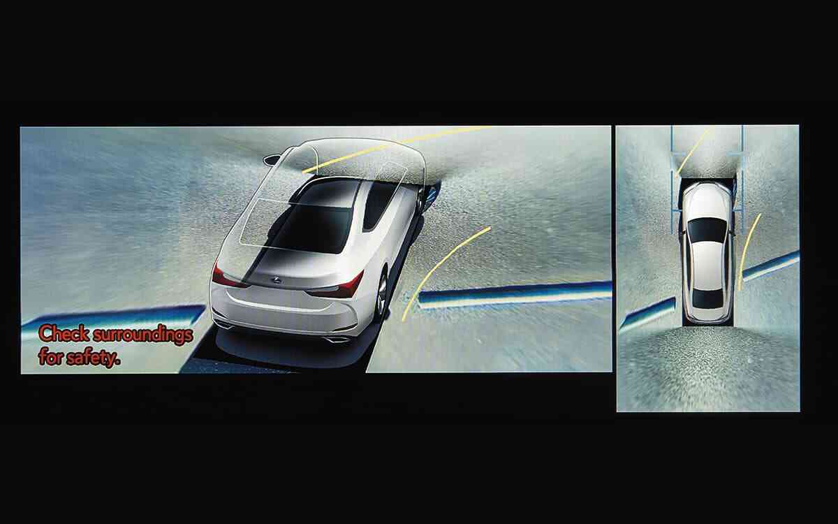 Hệ thống camera 360 độ trên Lexus ES300h cung cấp tầm nhìn toàn cảnh xung quanh xe, đặc biệt hữu ích khi đỗ xe hoặc di chuyển trong không gian chật hẹp. Camera có độ phân giải cao với chức năng phóng to và nhiều góc nhìn khác nhau. Cảm biến đỗ xe trước sau phát hiện chướng ngại vật và cảnh báo bằng âm thanh với tần suất tăng dần khi tiến gần.